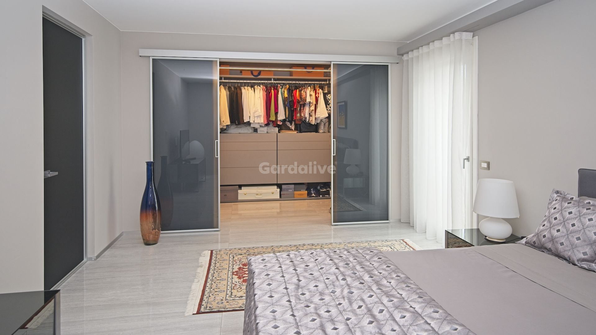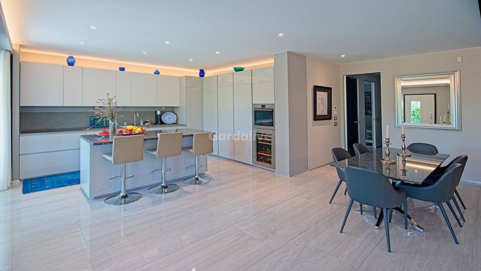 L'ingresso principale si apre su un'ampia e luminosa zona soggiorno/cucina/pranzo. Splendide piastrelle in gres porcellanato, una cucina di design, illuminazione d'atmosfera e porte a filo Rimadesio™creano un'atmosfera elegante con i comfort del riscaldamento e raffrescamento a pavimento e dell'aria filtrata. Un sistema di allarme con porta blindata e finestre con triplo vetro garantiscono un ambiente sicuro e tranquillo.