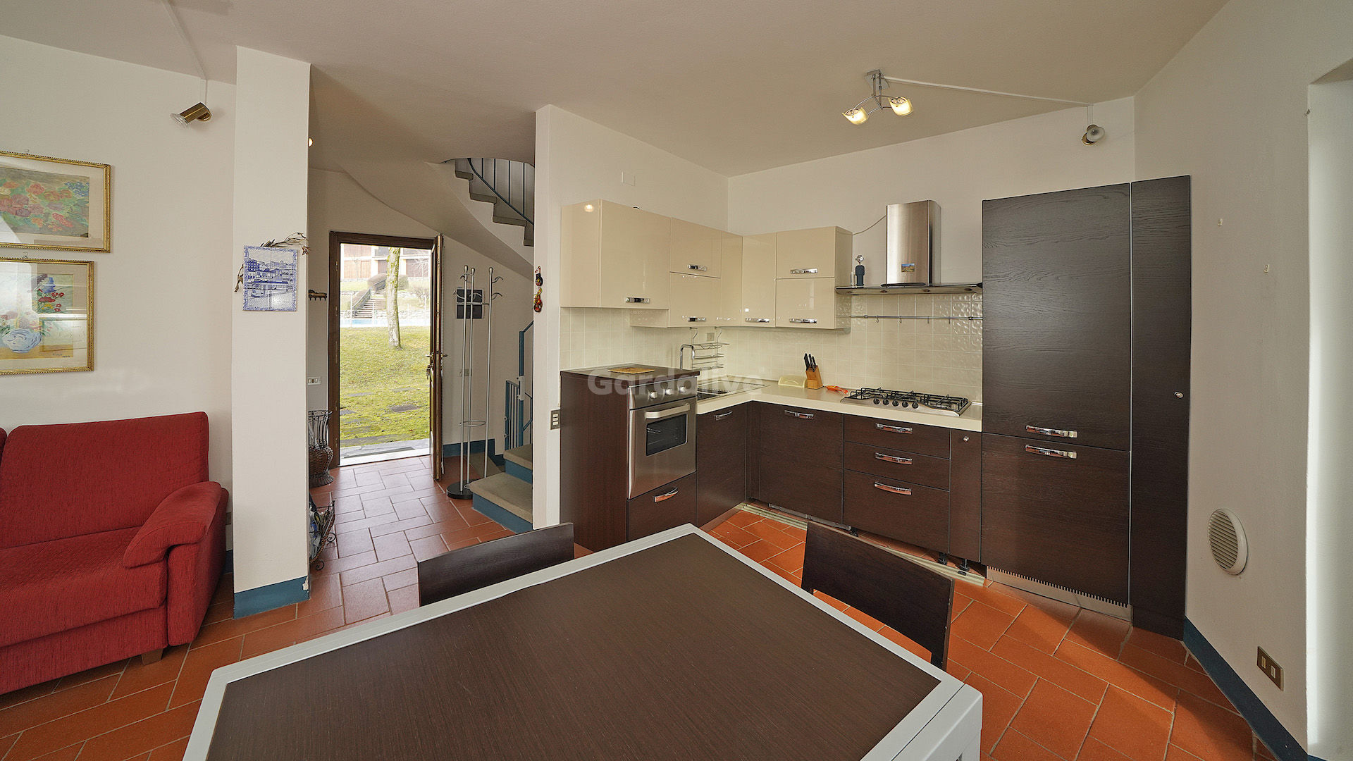 Al piano terra troviamo un luminoso soggiorno con angolo cottura, con accesso diretto al porticato e al giardino condominiale ad uso esclusivo, oltre a un bagno di servizio.