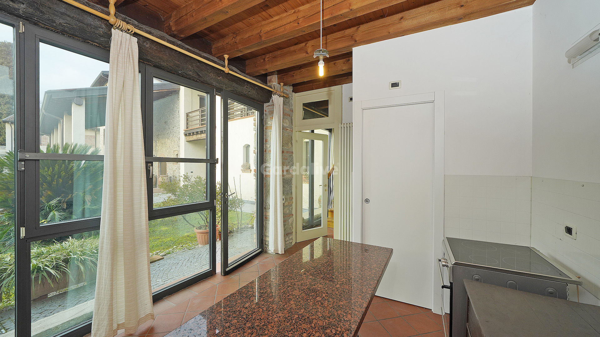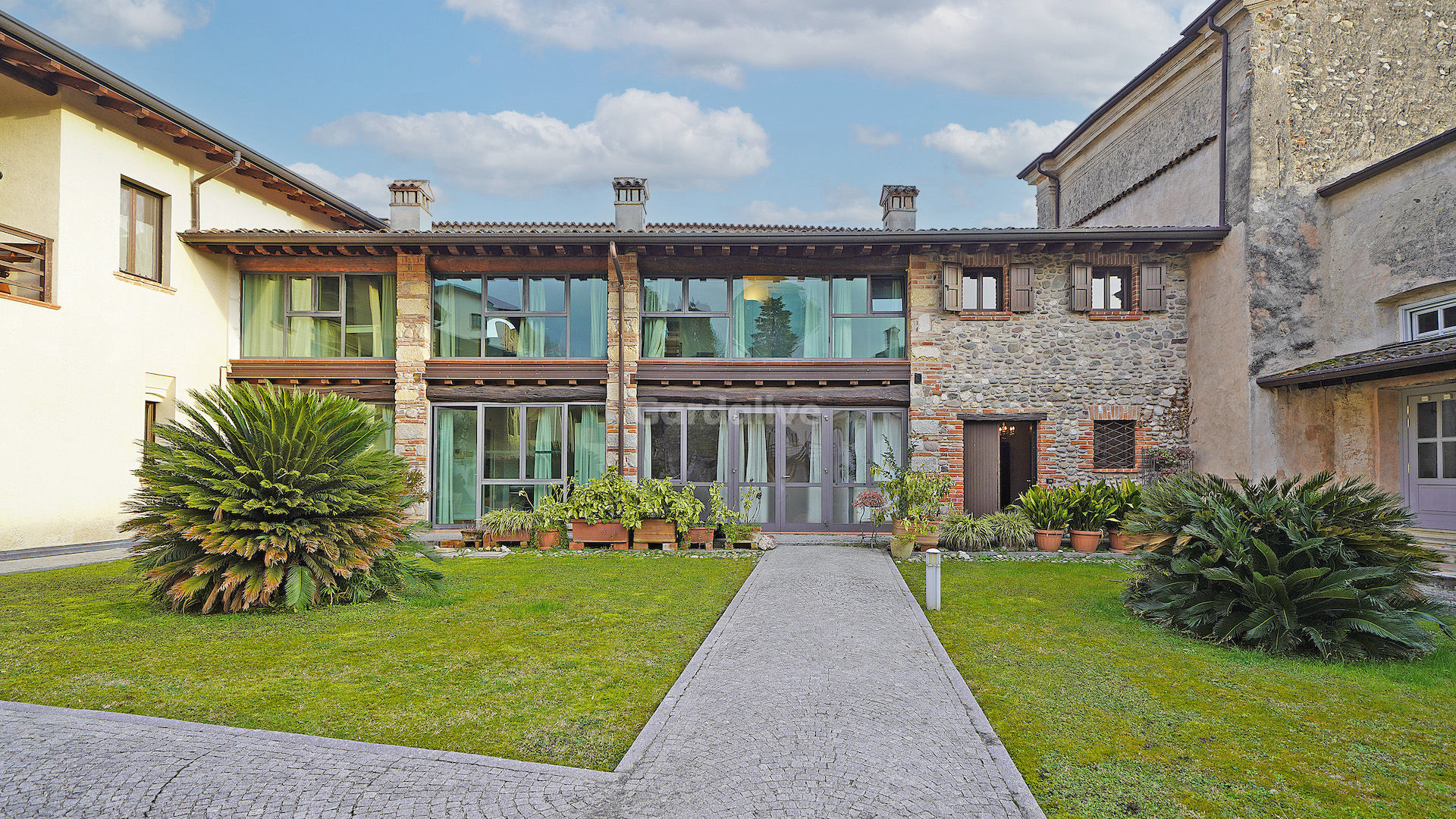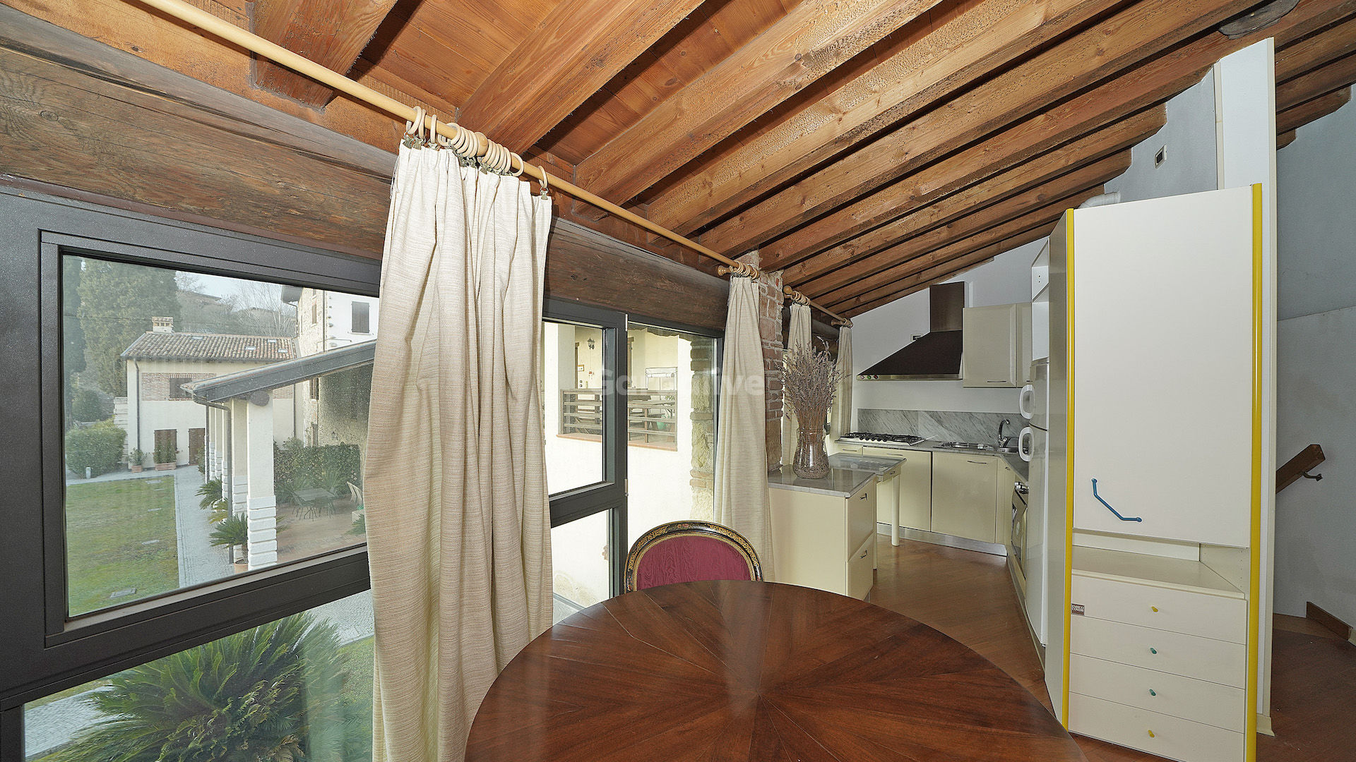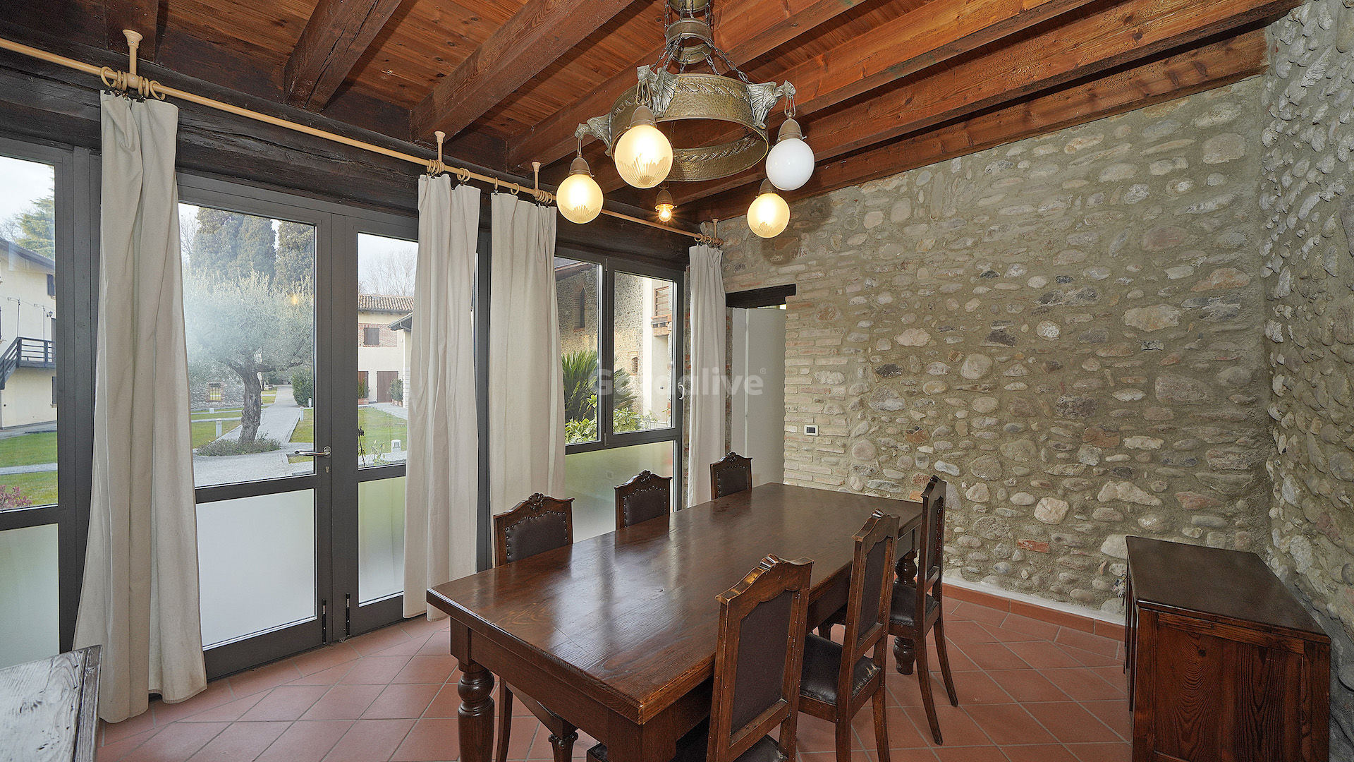 La proprietà, che si sviluppa su due piani per un totale di 150mq. calpestabili, si distingue per i suoi soffitti a travi in legno, per le pareti in pietra a vista e per le ampie vetrate panoramiche, che garantiscono una meravigliosa luce naturale e che rendono l'ambiente accogliente e caloroso. Esternamente, l'immobile gode di un porticato.
