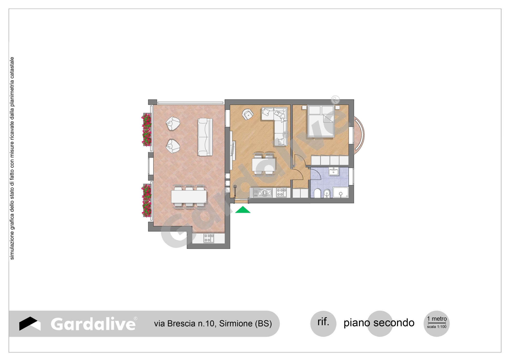 The bright and well-designed flat offers generous space. The spacious living area is composed of living room and kitchenette. An elegant French door reaches a wonderful 32 sqm private terrace, perfect for having breakfast or enjoying a fantastic view of Lake Garda. The kitchen is fully equipped and has a very useful mezzanine, suitable for storage or as a sleeping area. The corridor leads to the bathroom with window and shower and a very bright double bedroom with a private balcony facing the garden and the shared swimming pool. The house has independent heating and a recently installed air conditioning system. Moreover, a covered parking space in the inner courtyard completes the property.