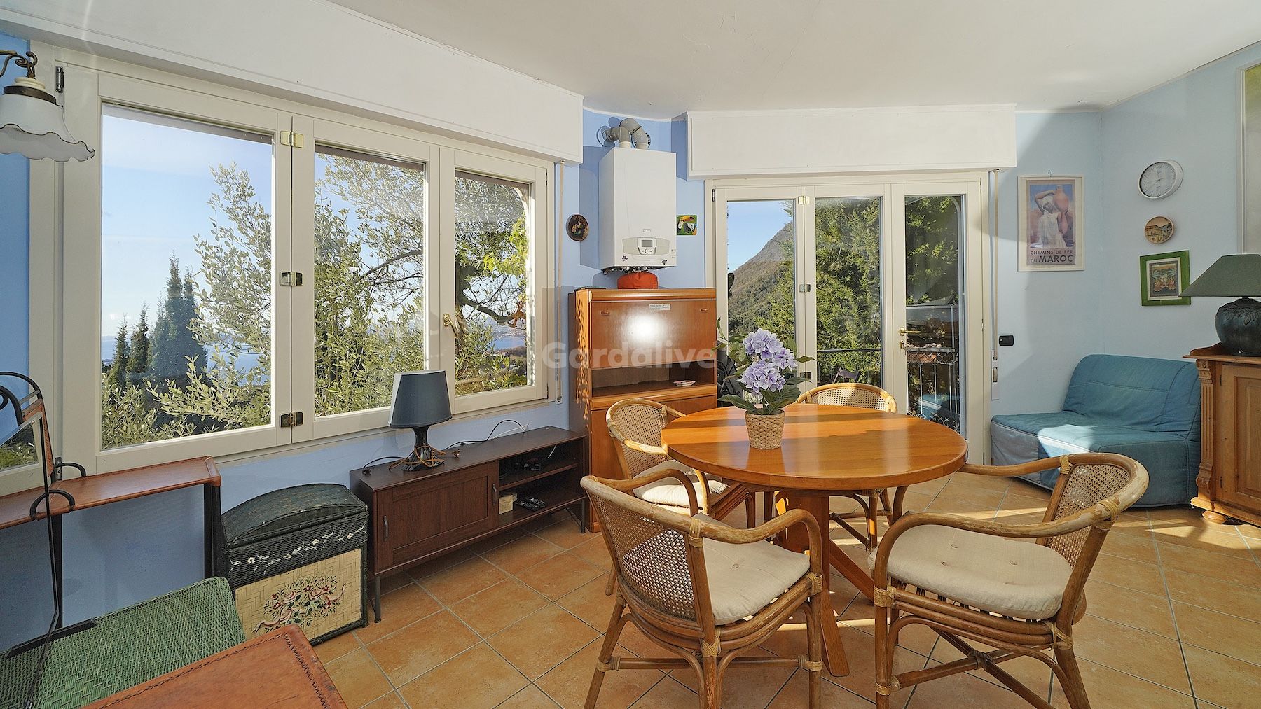 The apartment, located on the ground floor, is accessed via a covered porch leading into a welcoming and well-laid-out interior. The entrance opens onto a bright living room, enhanced by a large window and a French door that leads to the panoramic terrace. From here, you can enjoy a wide, commanding view of the lake, with a picturesque glimpse framed by the surrounding hills—an ideal space for outdoor dining and relaxing in complete privacy.